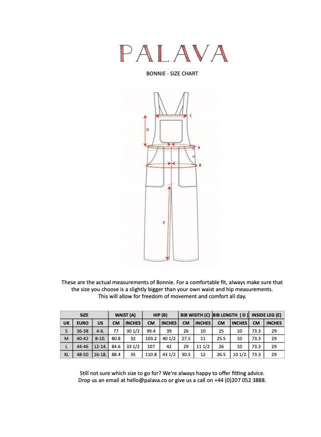 Bonnie has extra roomy pockets (yes, even for us!) and adjustable straps. Our Bonnie dungarees now have a line of elastic at the back to tie the waist in slightly and improve their fit.