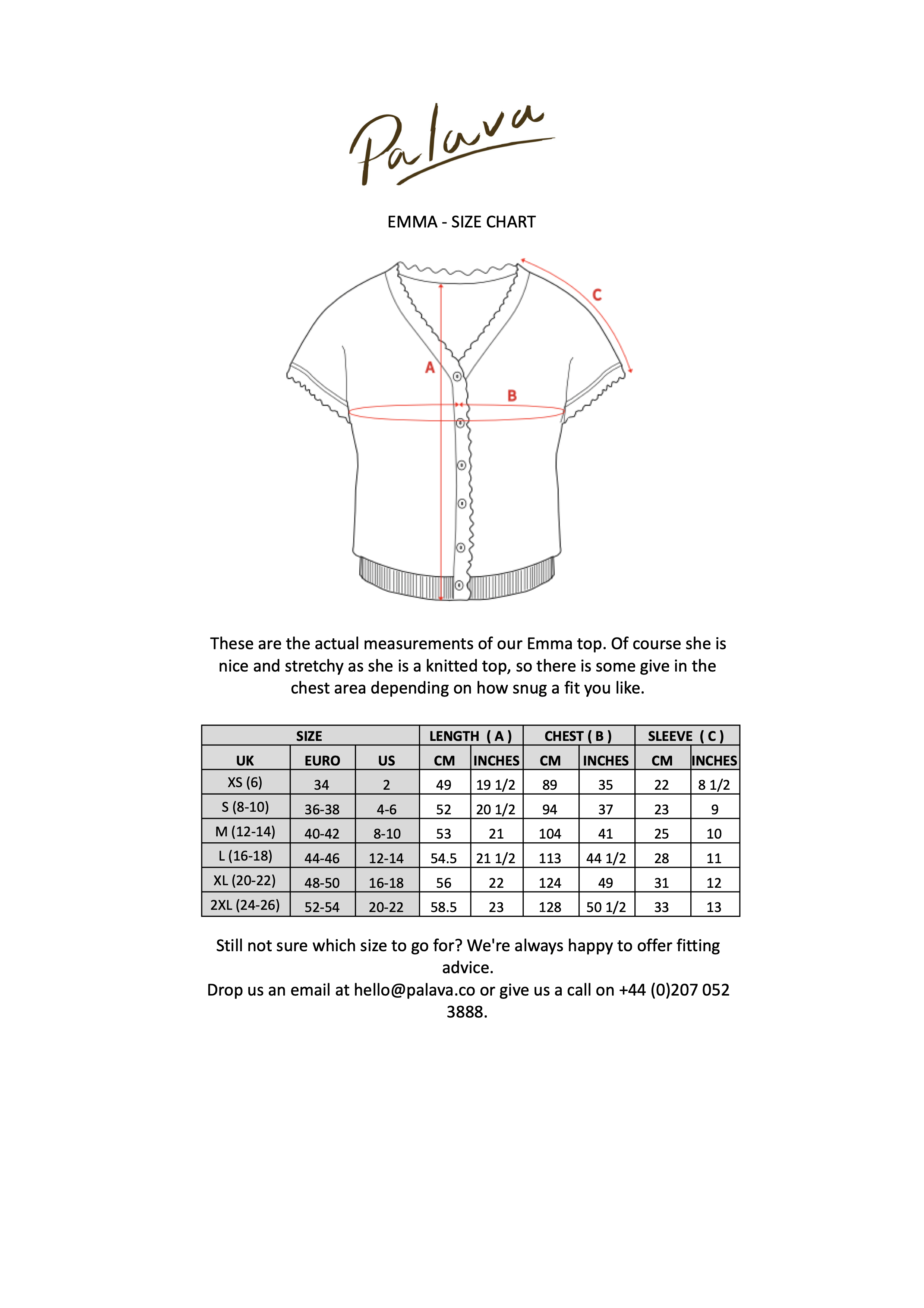 About the Style: We're excited to welcome the all-new Emma knitted top to the Palava family. This scallop-edged short-sleeve top has buttons down the front and a lovely weight for those transitional days between spring and summer when we’re not quite sure what the weather will do next.