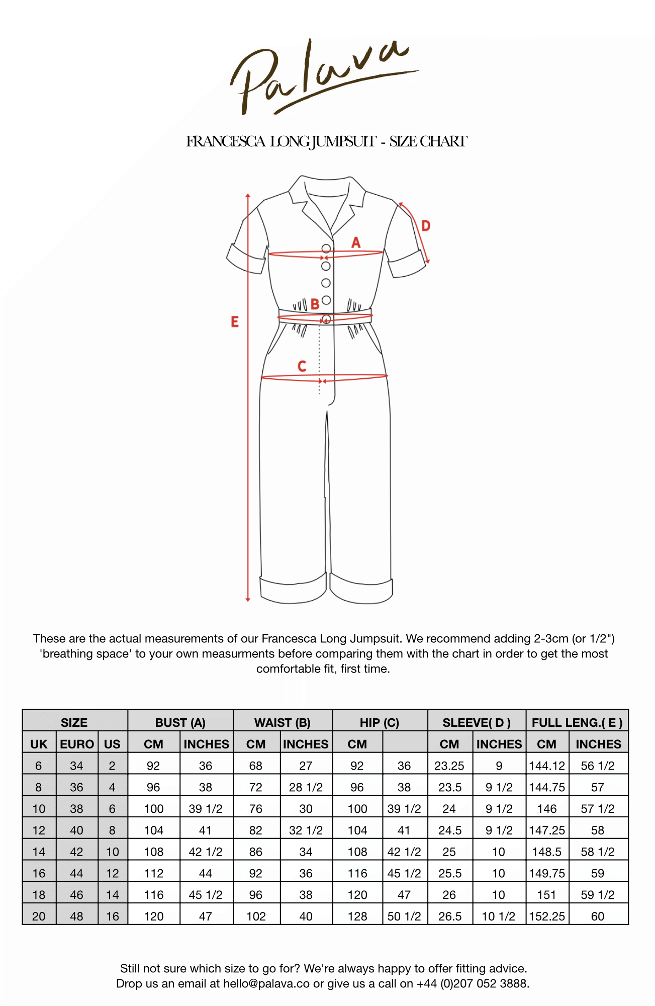 About the style: Ultimate comfort meets effortless style with our Francesca jumpsuit. It’s super versatile and can be worn dressy with heels or relaxed with hi-tops. Having an elasticated waist allows for full movement, whilst still providing an elegant silhouette. We've tweaked her a little this summer to have a longer leg and a longer sleeve, allowing you to wear her all year round. Who doesn't love even more styling options?! As usual, Francesca also has deep pockets for all your bits and bobs!