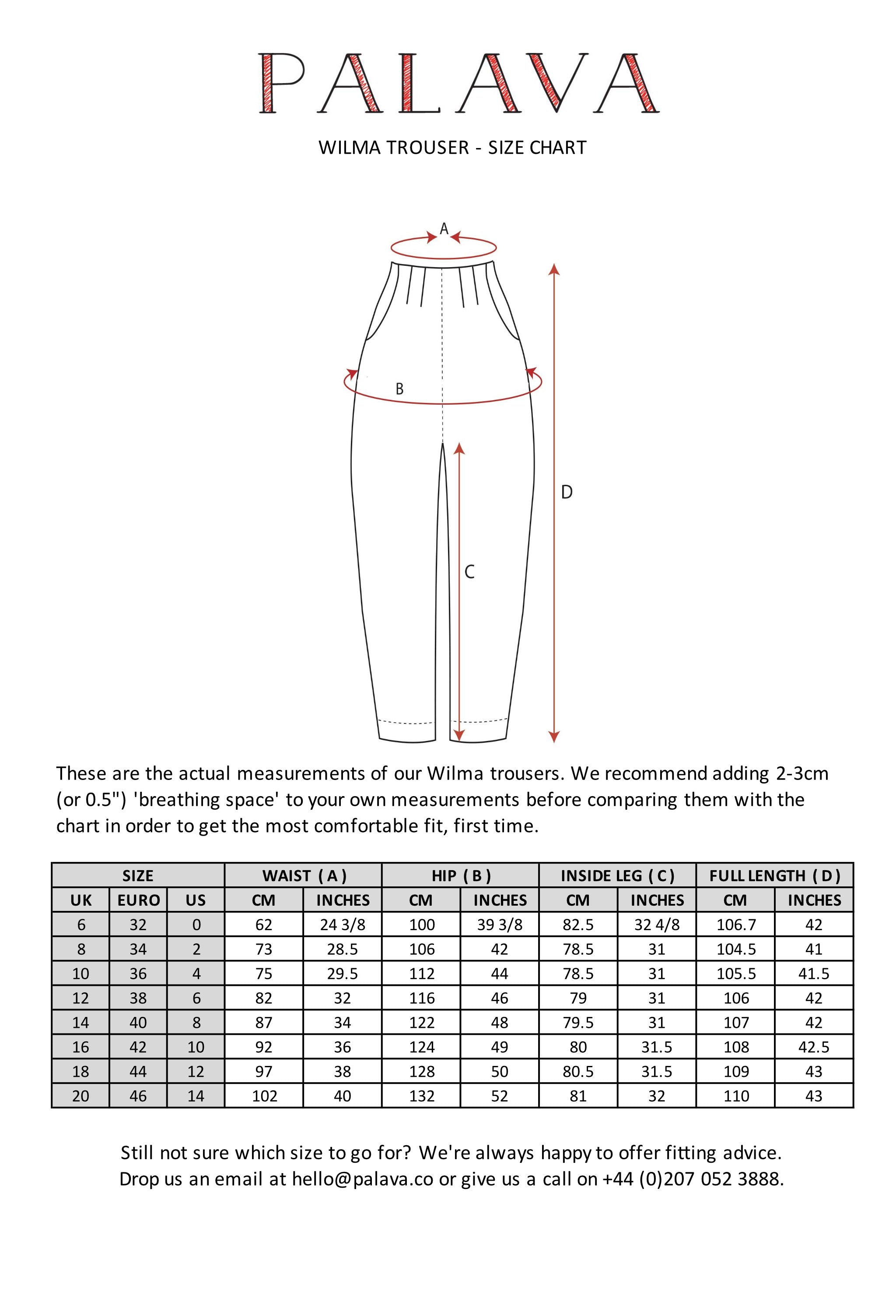 * We have improved the sizing of Wilma this season. If you have previously bought these trousers, the sizing has changed. What was a 10 last season is now being sold as a 12. What was sold as size 12 is now being sold as a 14, etc. If you are unsure of your size, please consult the size chart or get in touch *
